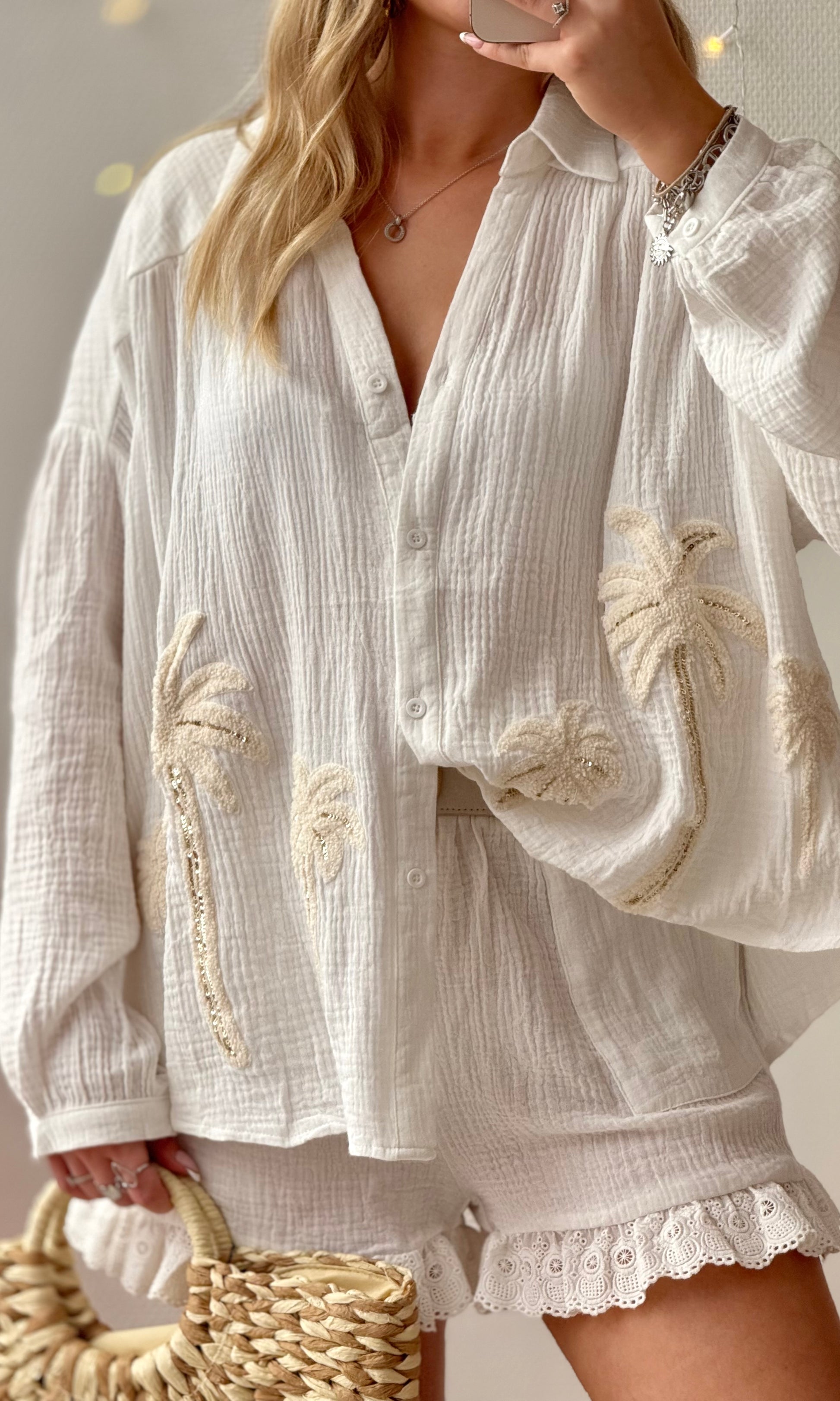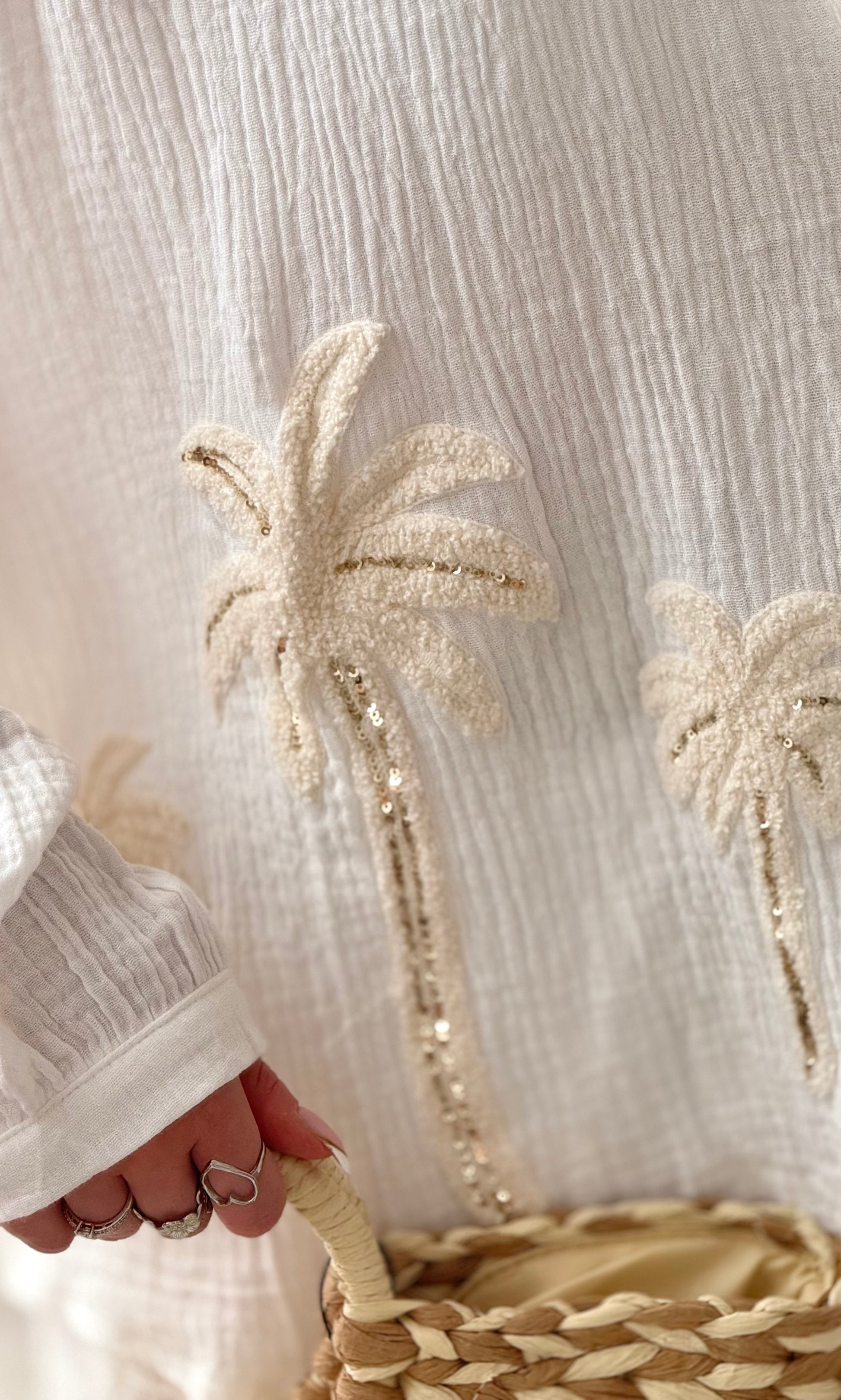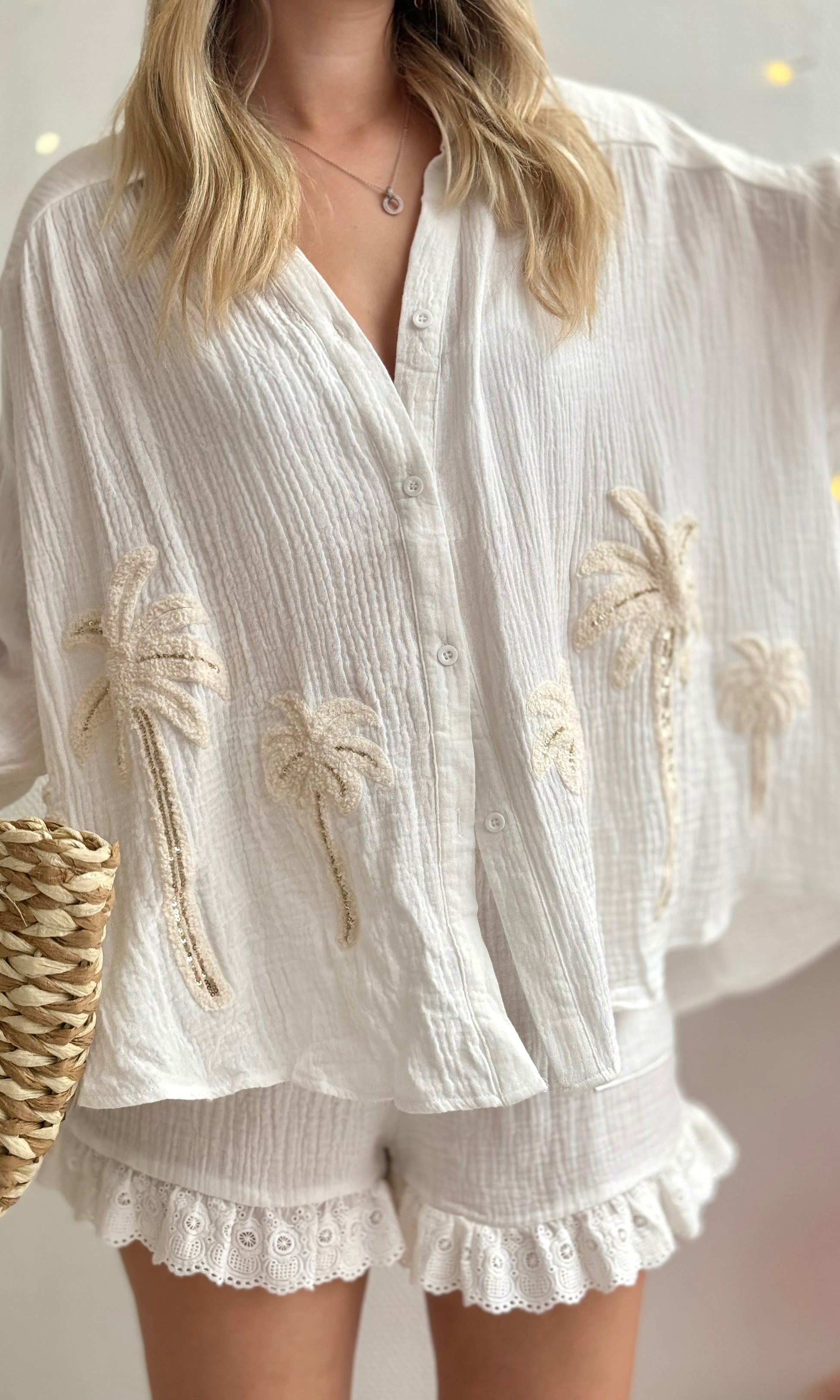 - Détails palmiers en sequins sur la chemise