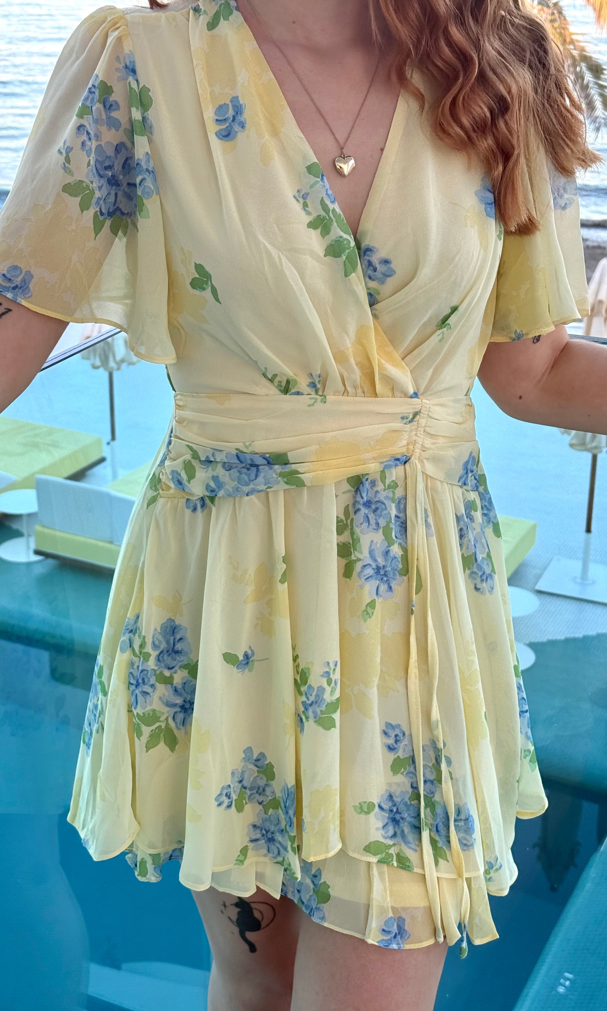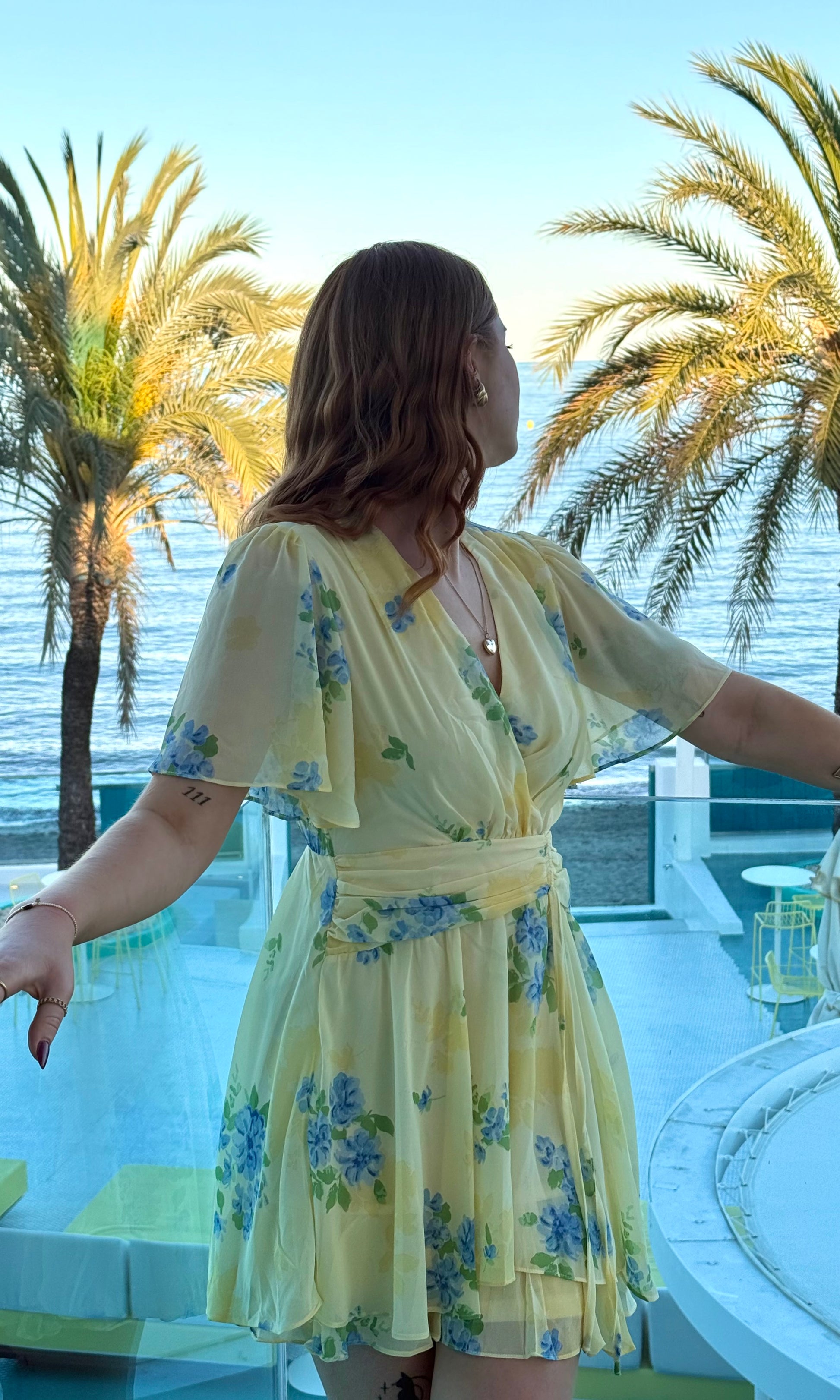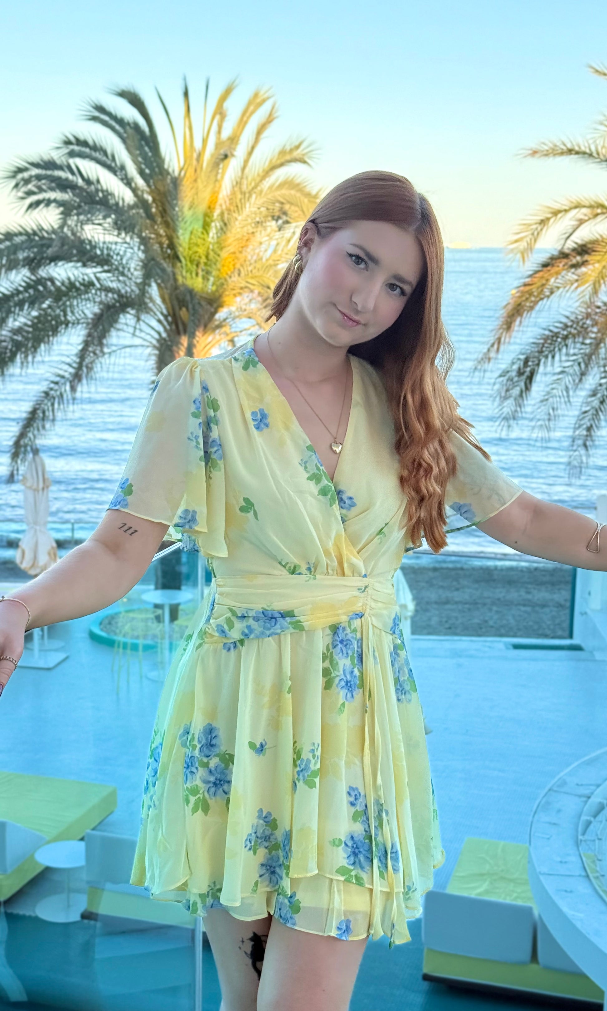 - Robe courte jaune avec des fleurs bleues
